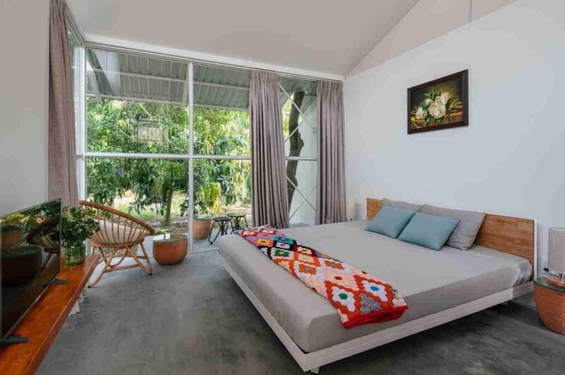 Homestay Đồng Tháp Duyencasa là sự kết hợp độc đáo giữa không gian trong nhà hiện đại và vẻ đẹp tự nhiên bên ngoài. Những ô cửa kính trong suốt được thiết kế tinh tế, giúp du khách có thể vừa thư giãn trong nhà, vừa có thể ngắm nhìn vẻ đẹp của khu vườn rộng lớn.