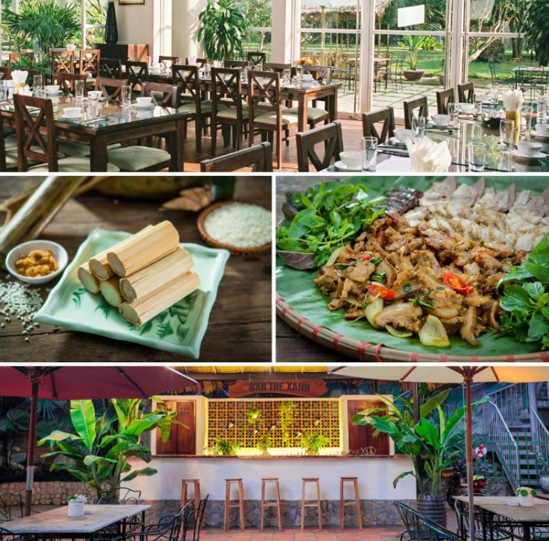 Nhà hàng của homestay phục vụ những món ăn đặc sản của vùng Kim Bôi, như măng chua, cơm lam, thịt lợn muối chua, rau rừng…