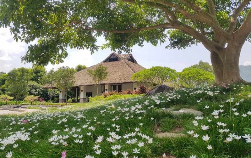 Khuôn viên resort được thiết kế với nhiều cây xanh, hoa lá, tạo nên một không gian xanh mát, trong lành.