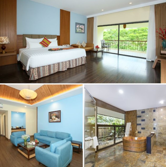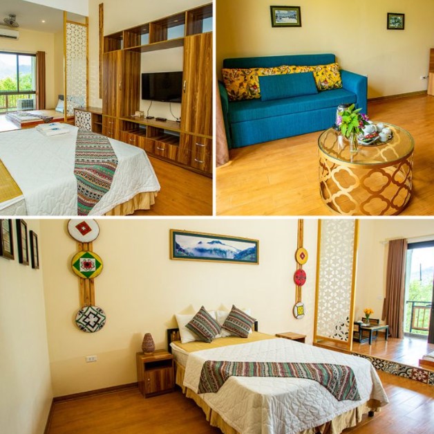 Đặc biệt, các phòng nghỉ còn được trang trí với những họa tiết thổ cẩm đặc sắc, góp phần tôn lên vẻ đẹp truyền thống của vùng đất Kim Bôi.