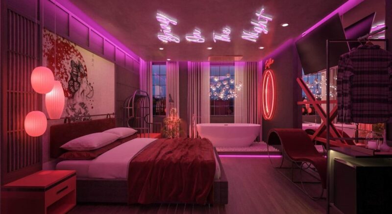 Các phòng nghỉ được trang bị giường êm ái, bồn tắm trong suốt, ghế tình yêu tantra, cùng với hệ thống đèn led tạo điểm nhấn, tạo nên không gian vô cùng cuốn hút và ấm cúng.