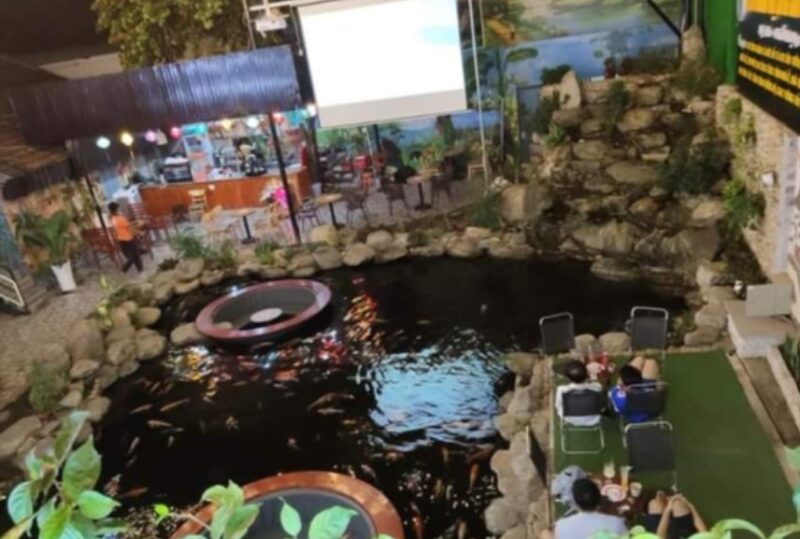 Bạn sẽ ấn tượng với hồ Hòn non bộ ngay giữa vườn, tô điểm thêm vẻ đẹp cho quán. Thi thoảng, bạn còn có thể ngửi thấy hương thơm nhẹ nhàng của hoa lan.